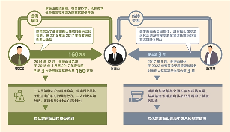 趙春玲:經(jīng)查,謝振山被免職后,于2015年4月至2017年春節(jié)前,先后3次收受陳某某現(xiàn)金共160萬元;謝振山退休后,于2022年春節(jié)收受原管理和服務(wù)對(duì)象商人趙某某所送茅臺(tái)酒3箱。因上述行為發(fā)生在謝振山退出領(lǐng)導(dǎo)崗位后,我們著重從謝振山與二人的平日交往、有無經(jīng)濟(jì)往來、收受時(shí)間、往來緣由、是否有謀利事項(xiàng)等方面收集固定證據(jù)。最終查明,160萬元系陳某某為感謝謝振山在任時(shí)提供的幫助而送,應(yīng)認(rèn)定謝振山收受160萬元的行為構(gòu)成受賄罪;謝振山在退休后收受趙某某為了維持關(guān)系而送的茅臺(tái)酒,應(yīng)認(rèn)定為違反中央八項(xiàng)規(guī)定精神。