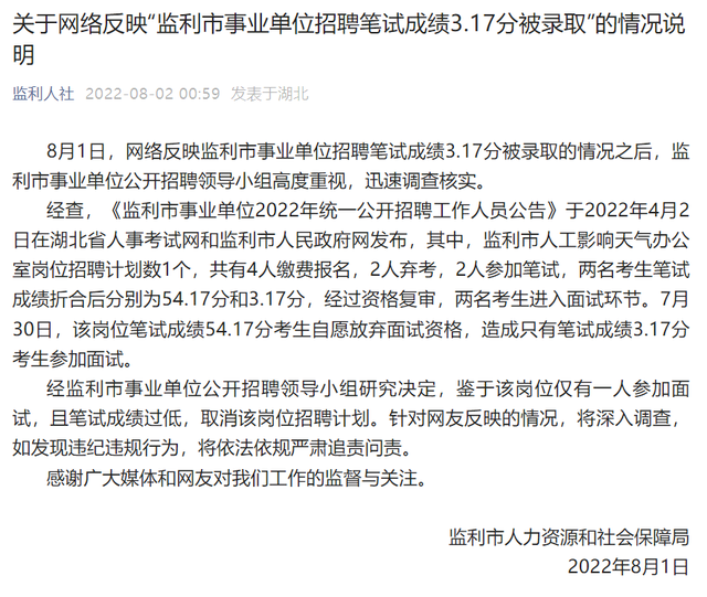 監利市人社局關于網絡反映事業單位招聘“筆試成績3.17分被錄取”的情況說明