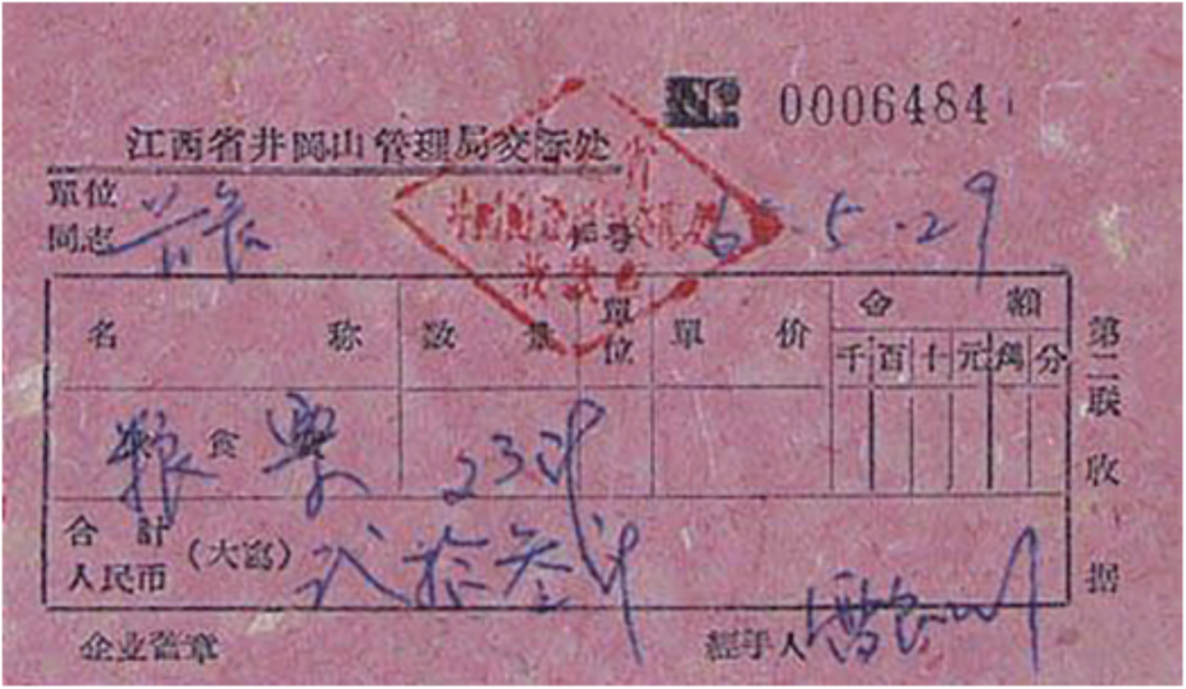 聽了他的話,會計只好拿出發票,但卻不知如何填寫這張發票,最后還是秘書提醒說:“交款人就寫首長吧!”會計又緊張又激動,在發票的交款人一欄中寫下“首長”二字,然后依次開出了三張發票,發票號碼為00006482、00006483、00006484,票證為“江西省井岡山管理局交際處”。毛澤東住宿時間7天,每天伙食費2.5元,共計17.5元。交糧票23斤,購大米款每斤0.12元,計2.76元。發票開具時間為1965年5月29日。