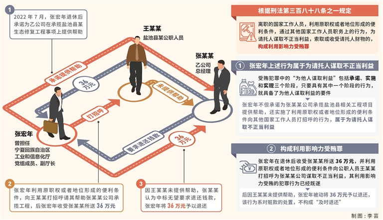 其中,2022年7月,張宏年在退休后接受乙公司總經(jīng)理張某某請托,承諾為乙公司在承攬鹽池縣某生態(tài)修復(fù)工程事項上提供幫助,后張宏年利用曾擔任寧夏回族自治區(qū)工業(yè)和信息化廳黨組成員、副廳長職權(quán)或者地位形成的便利條件,向鹽池縣某公職人員王某某打招呼,請其對乙公司中標相關(guān)工程項目給予關(guān)照。張宏年收受張某某所送現(xiàn)金36萬元。因王某某未提供幫助。一周后,張某某認為中標無望要求退還錢款,張宏年將36萬元予以退還。