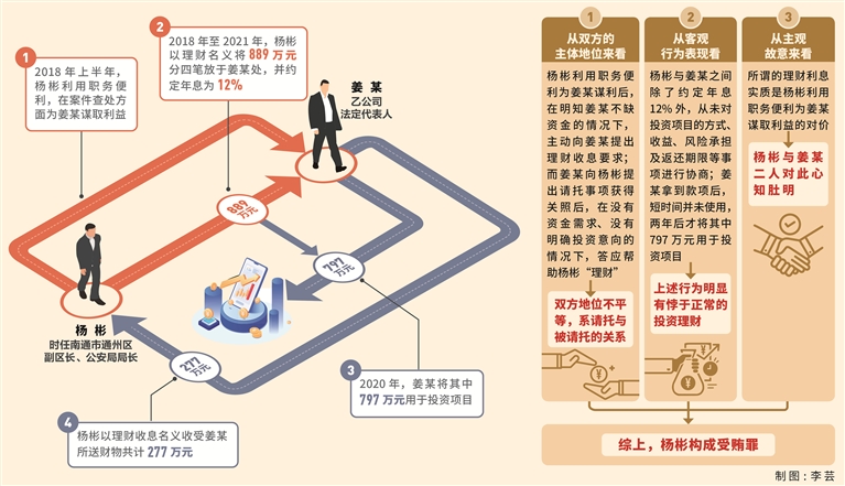 其中,2018年上半年,楊彬利用擔任南通市通州區副區長、公安局局長的職務便利,在案件查處方面為乙公司法定代表人姜某謀取利益。2018年至2021年,楊彬以理財名義將889萬元分四筆放于姜某處,并約定年息為12%,姜某并無投資、理財需要,直至2020年下半年才將其中797萬元用于投資項目。楊彬以理財收息名義收受姜某所送財物共計277萬元。