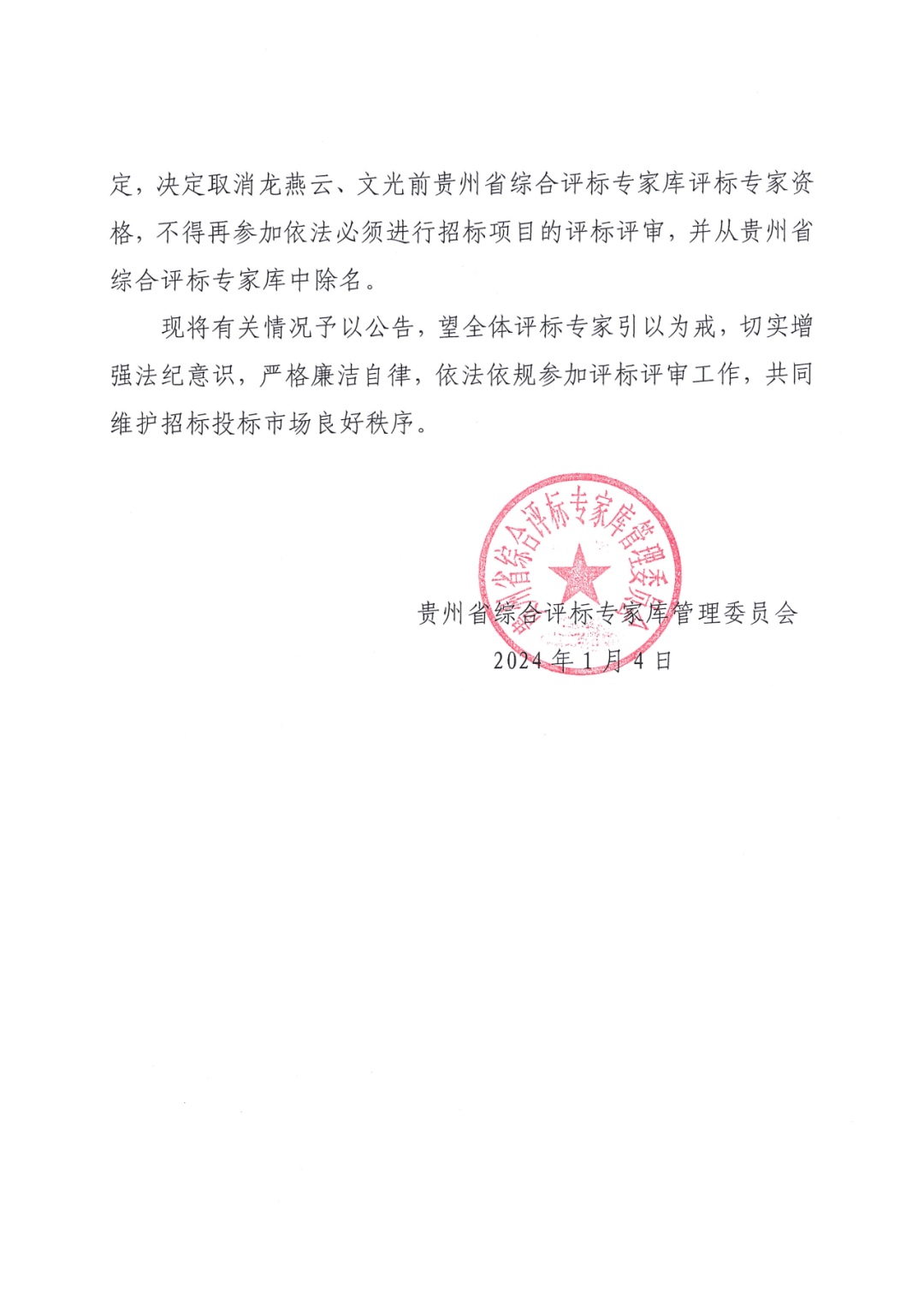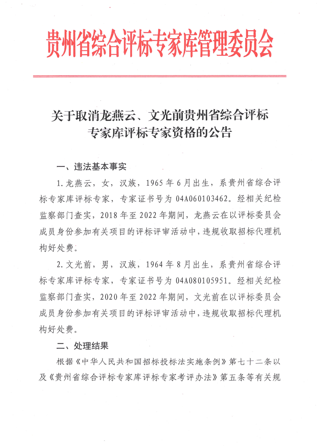 貴州省綜合評標專家庫管委會關于取消龍燕云、文光前評標專家資格的公告