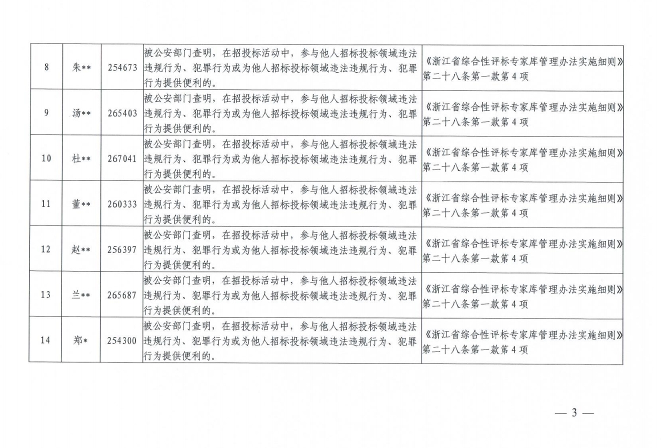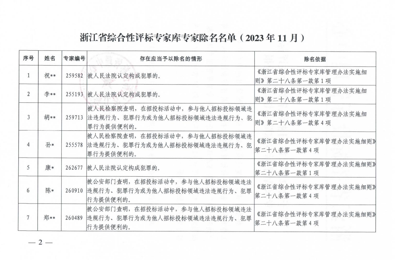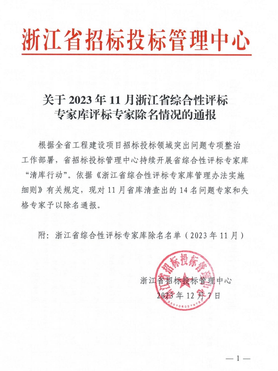 浙江省招標(biāo)投標(biāo)管理中心關(guān)于2023年11月浙江省綜合性評標(biāo)專家?guī)煸u標(biāo)專家除名情況的通報