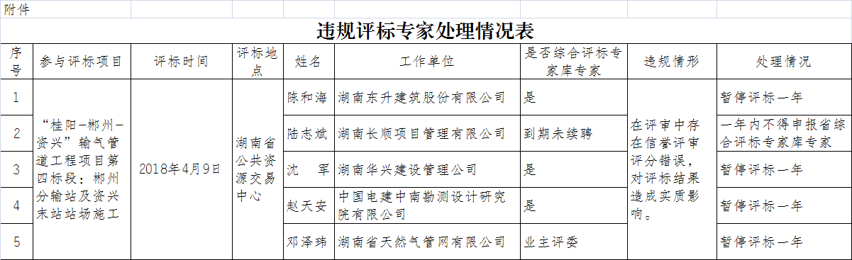 根據《湖南省綜合評標專家庫和評標專家管理辦法》第三十七條第三項規定,為嚴肅評標工作紀律,加強對評標專家的監督管理,經研究決定,對陳和海、陸志斌、沈軍、趙天安、鄧澤瑋等5名評標專家暫停評標一年。