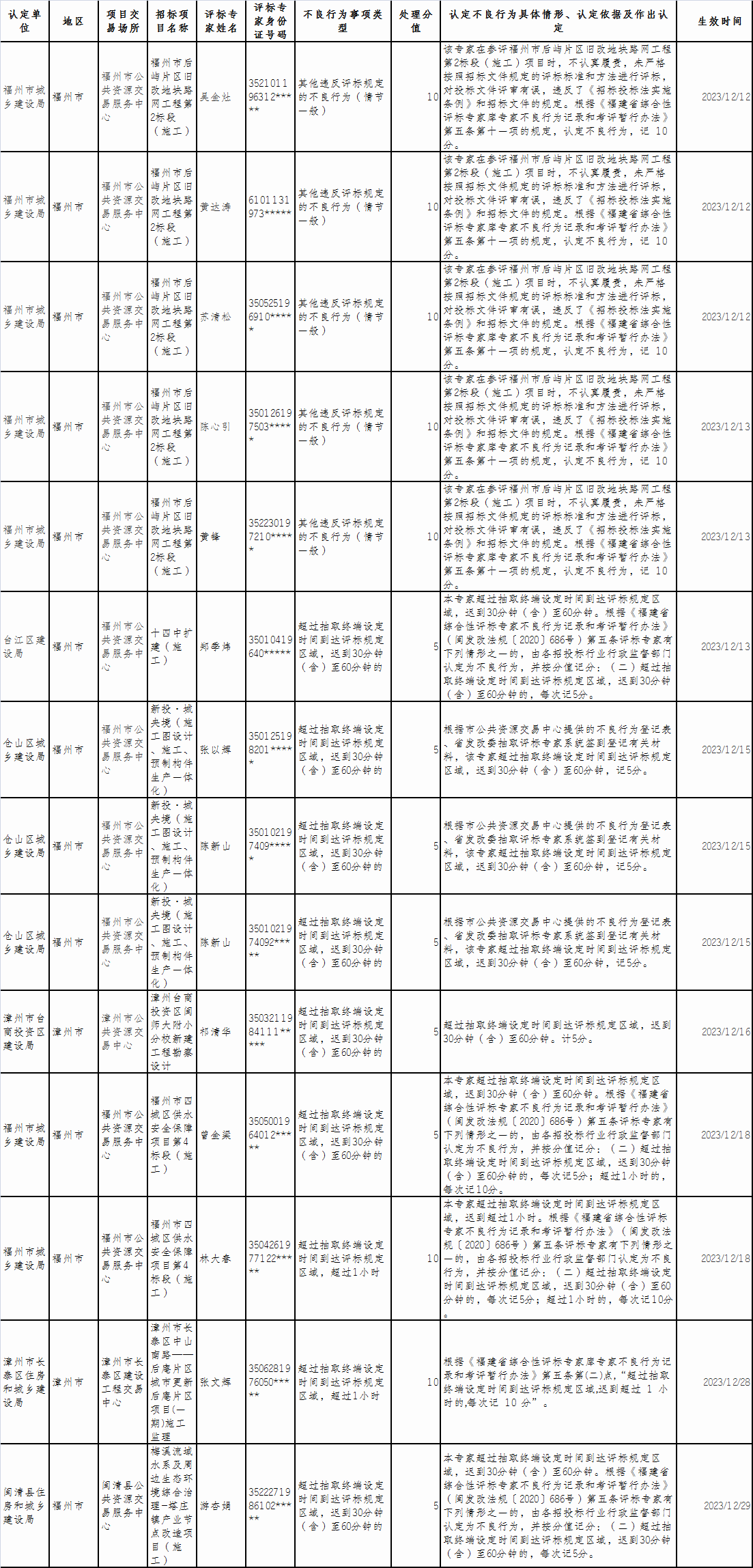 福建省評標專家不良行為公示(2023年12月)