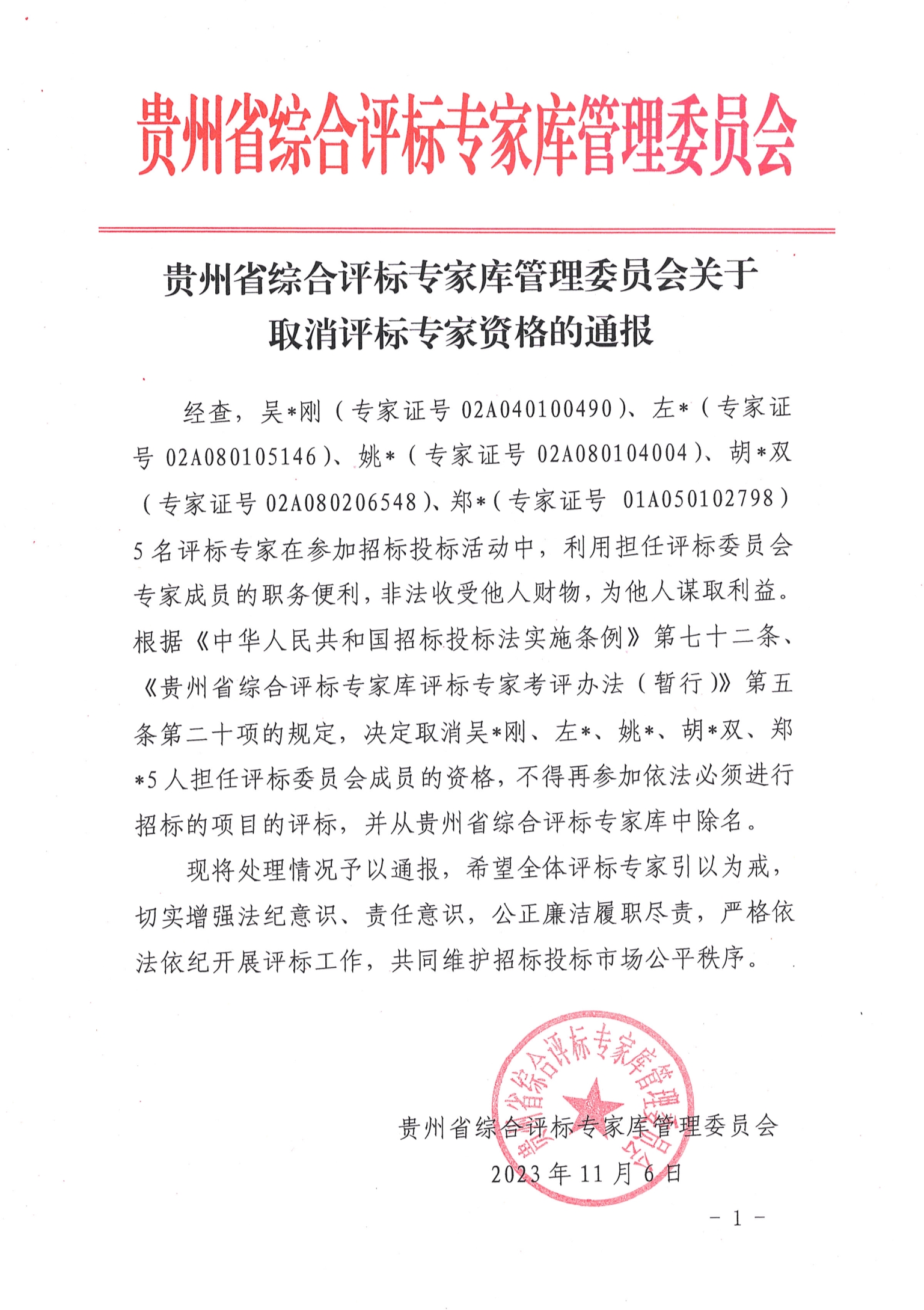 貴州省綜合評標專家庫管理委員會關于取消吳某剛等五名評標專家資格的通報
