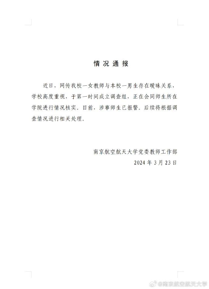 南京航空航天大學(xué)黨委教師工作部關(guān)于網(wǎng)傳女教師與本校男生存在暖昧關(guān)系的情況通報