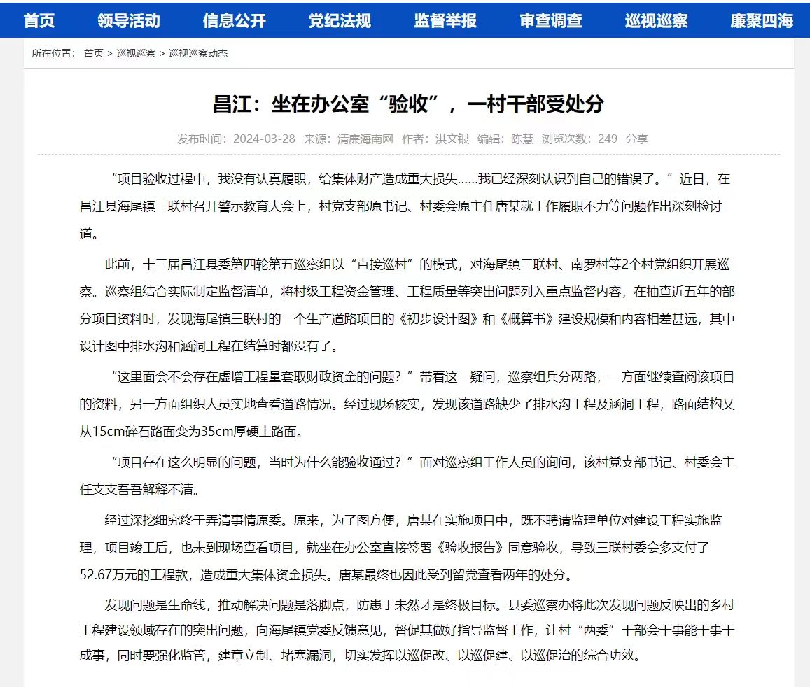 昌江縣海尾鎮三聯村黨支部原書記、村委會原主任唐某坐在辦公室驗收,造成重大集體資金損失,受到留黨察看兩年處分