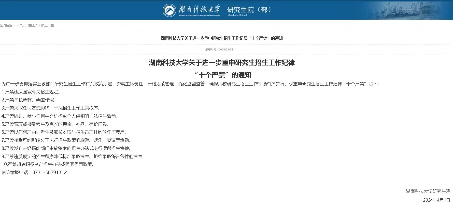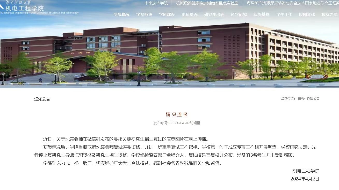 湖南科技大學機電工程學院教師沈某違反研究生招生“十嚴禁” 被取消復試評審資格 停止研究生導師任職資格和研究生招生資格