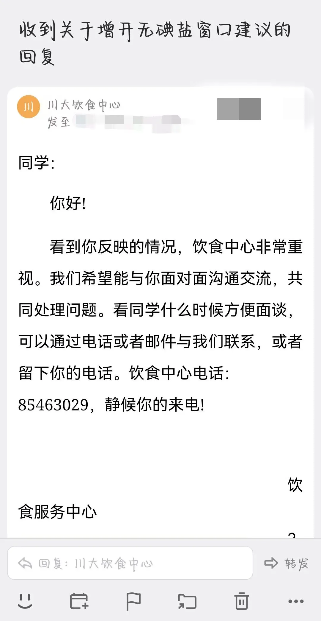 四個月前,來自輕工科學與工程學院的L同學檢查出甲亢,吃藥三個月后,病情慢慢好轉,但復查后醫生告知她仍需繼續吃藥,并且生活中的各個方面都要多注意。 思來想去,最終L同學決定從飲食方面下功夫。但在寢室住宿不管是從時間精力還是從條件上來說都無法自己做飯。于是,L同學抱著試一試的想法,給學校反映了自己的訴求。 不久后,L同學收到了川大飲食服務中心的回信。