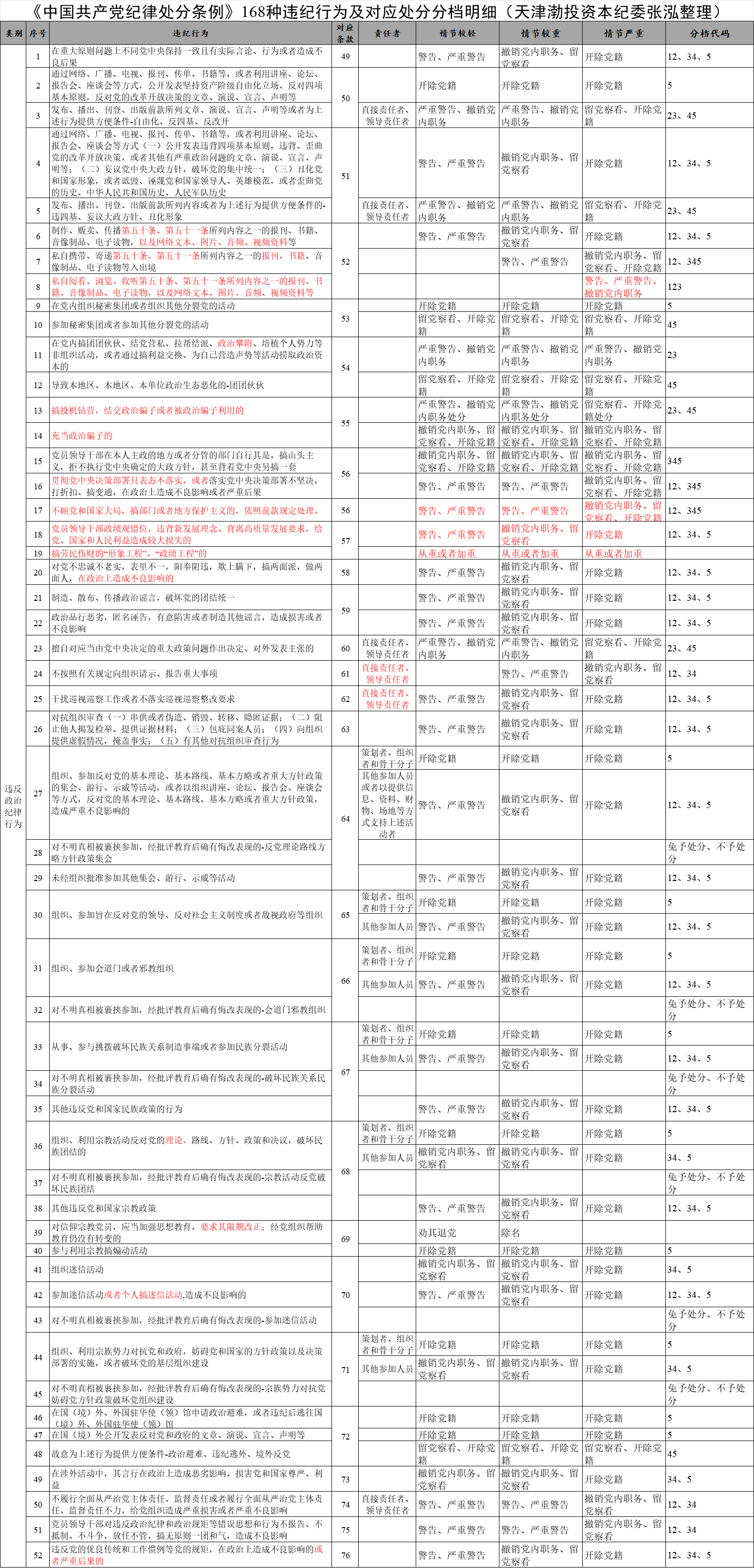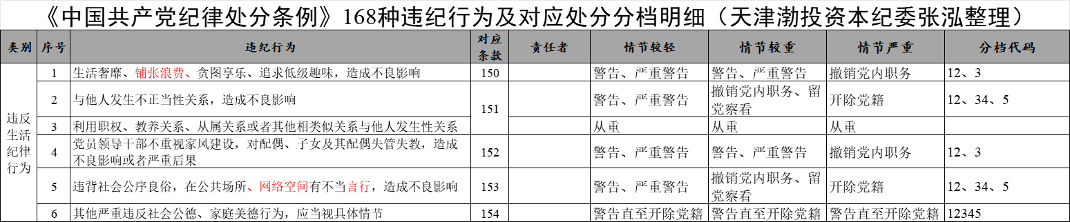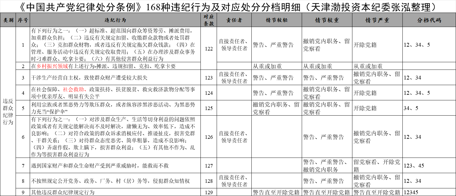 《中國共產黨紀律處分條例》168種違紀行為及對應處分分檔明細