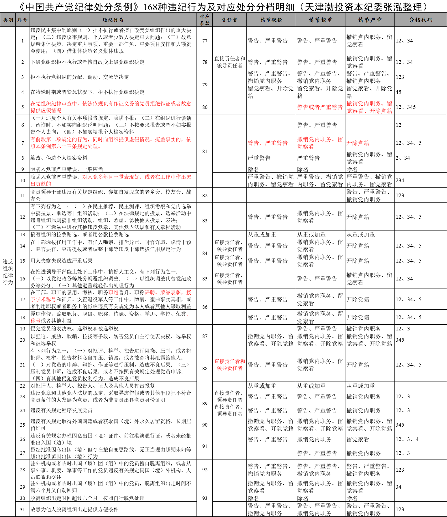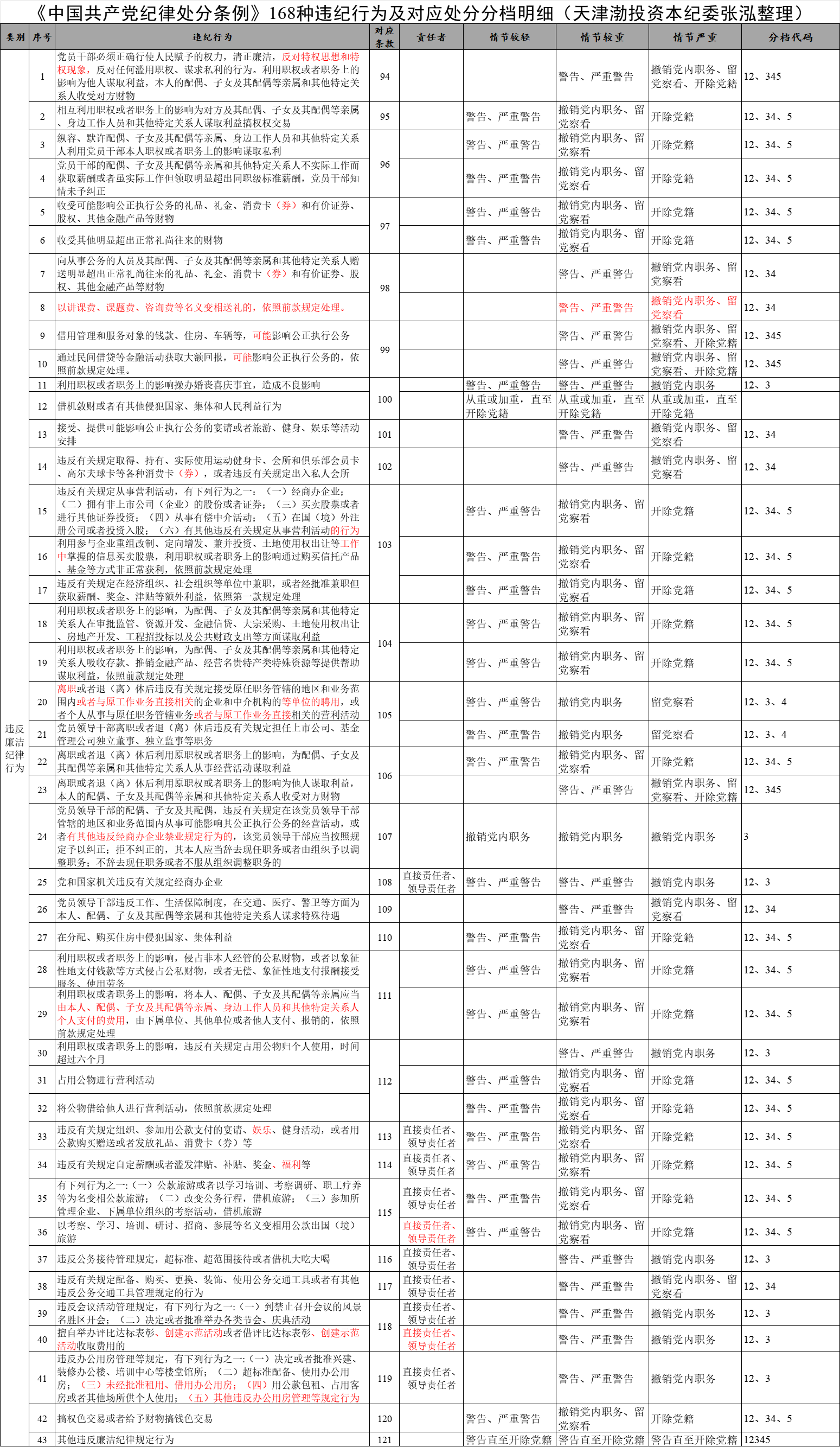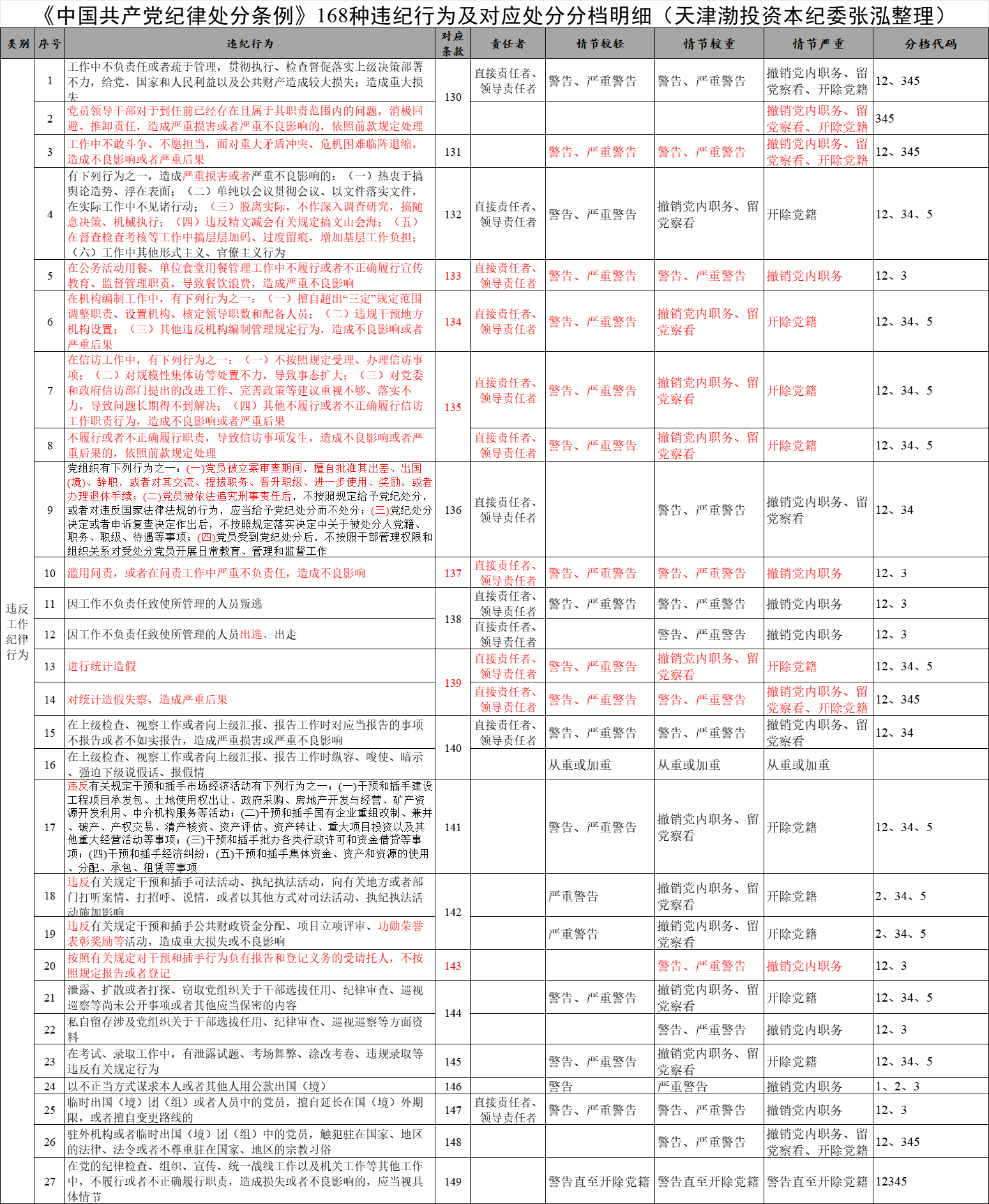 《中國共產黨紀律處分條例》168種違紀行為及對應處分分檔明細