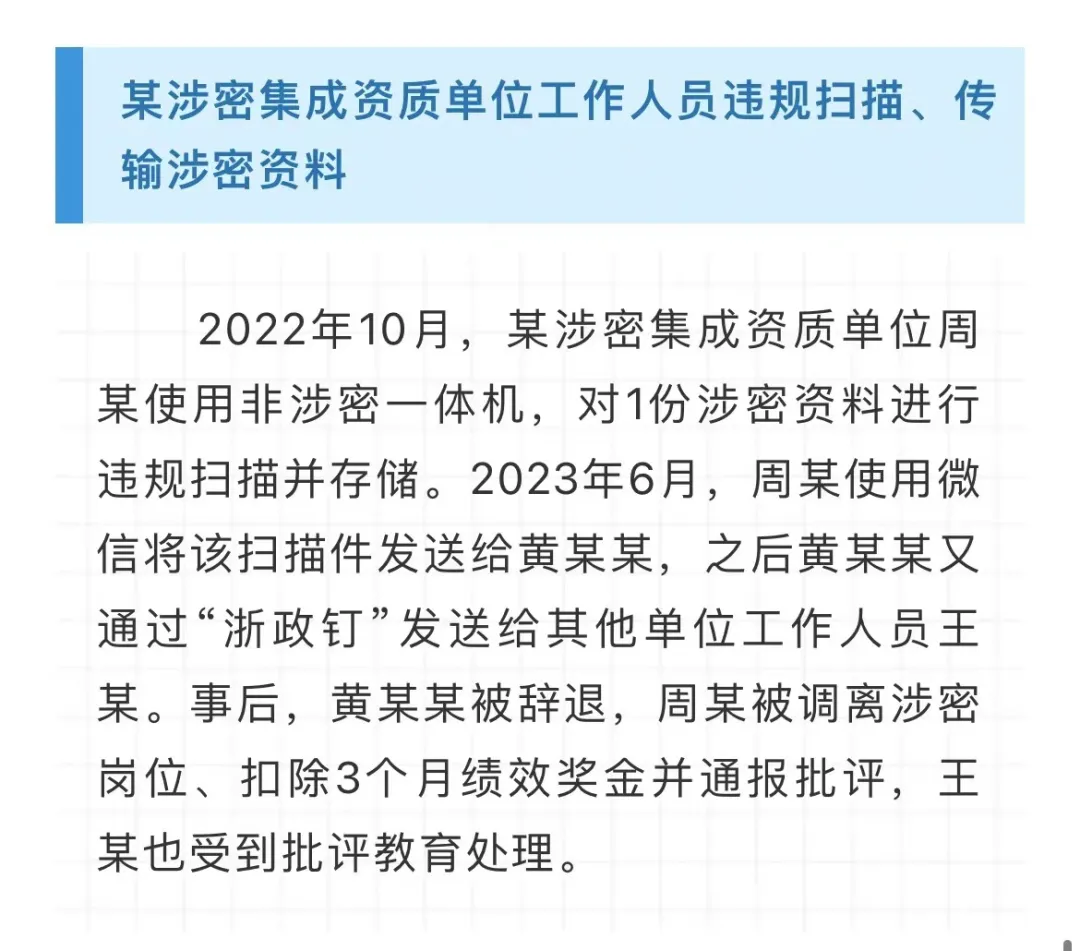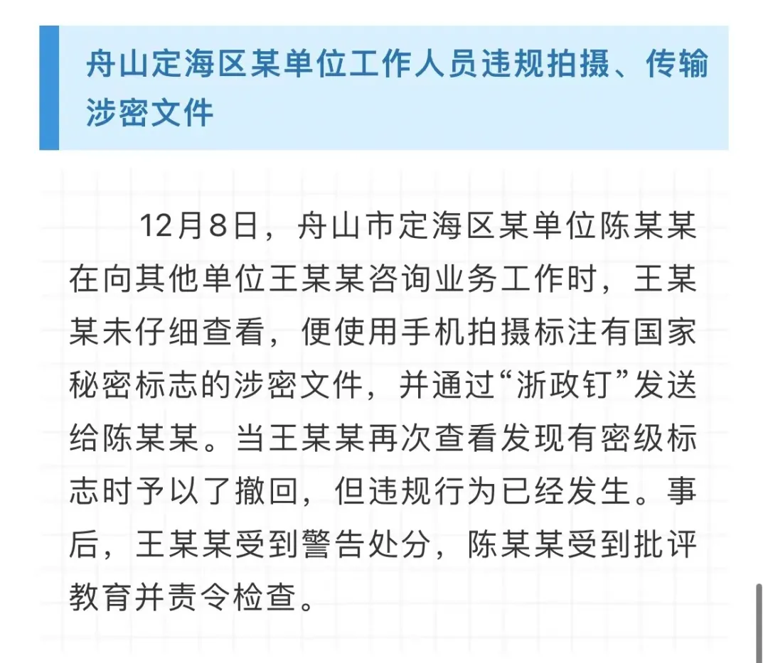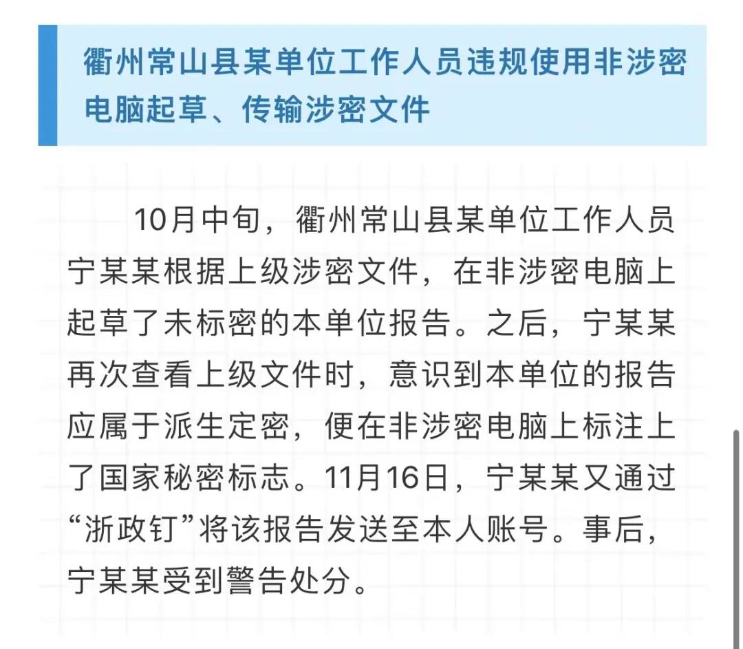 2023年,浙江省委保密辦、省國家保密局依紀依法依規查處了一批違反保密法律法規的案件,為充分發揮懲前毖后的警示教育作用,現將7起典型案例通報如下。