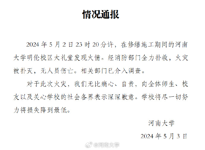 5月2日,河南大學(xué)明倫校區(qū)大禮堂發(fā)生火災(zāi)事故,影響重大。國務(wù)院安委會決定,對該起火災(zāi)事故查處實行掛牌督辦,并派出督辦組赴當?shù)囟酱僦笇?dǎo)河南省調(diào)查組工作,要求科學(xué)嚴謹盡快查明事故原因,依法依規(guī)嚴肅追責問責。