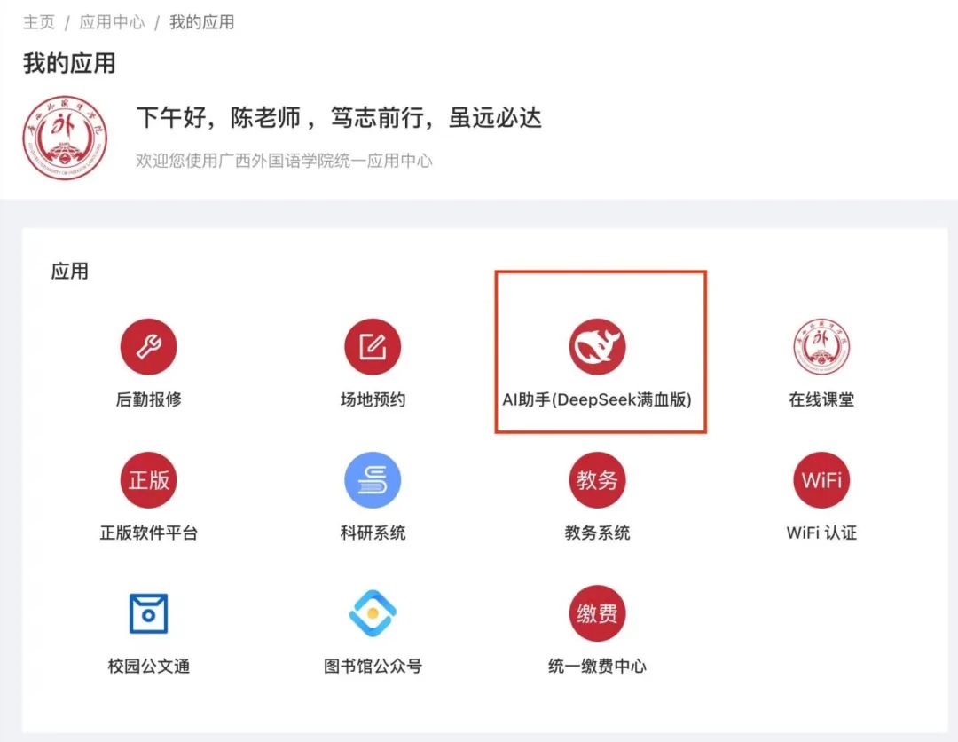 學校統一應用中心借助DeepSeek大模型強大的推理與檢索能力,構建了一個靈活高效的AI應用系統。依托已建成的統一身份認證體系,該平臺可根據全校師生的不同角色自動賦權,真正實現大規模自動賦能,為校園內各項智能應用場景提供堅實支持。此項創新應用,不僅提升了管理效率,也為打造具有廣西外院特色的智慧校園奠定了基礎。