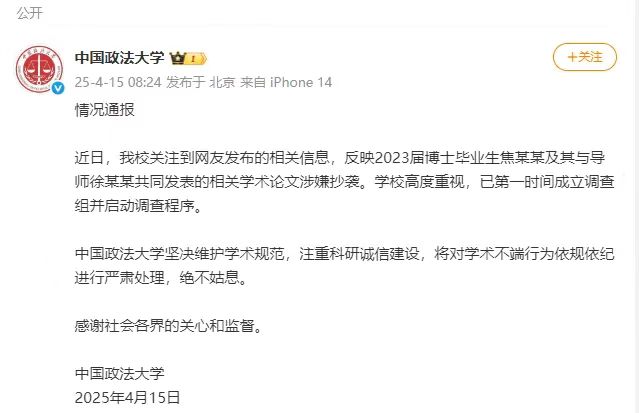 中國政法大學(xué)對網(wǎng)友反映相關(guān)論文涉嫌抄襲的情況通報