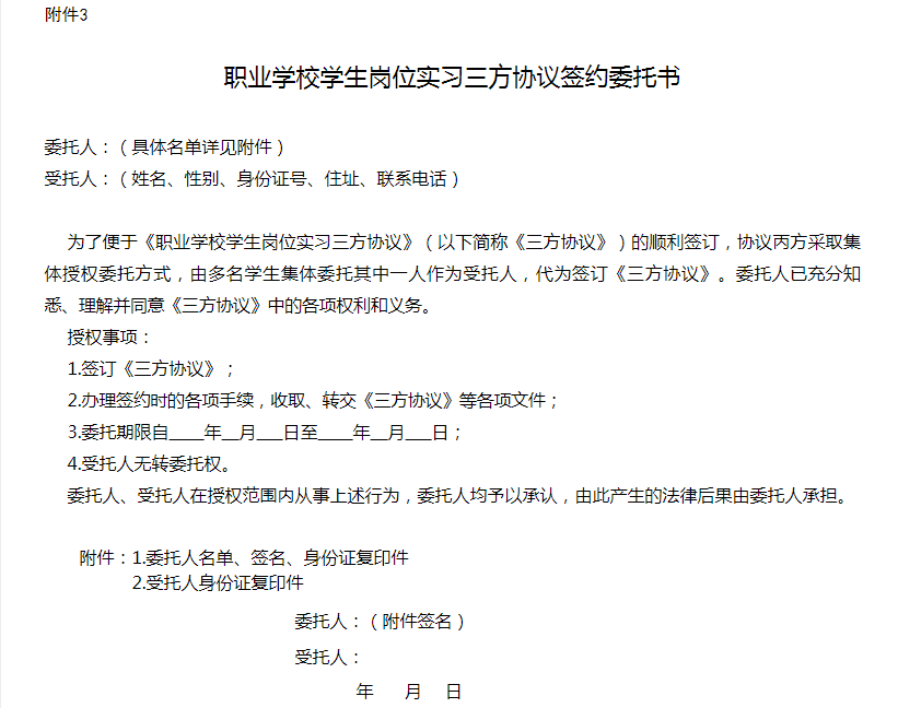 7.如丙方集體簽訂協議,需由丙方代表簽字,其他所有丙方需簽訂相應委托書,并作為本協議的附件。丙方代表在簽字前,應將協議文本內容提前告知每一位參加崗位實習的學生(丙方)及其法定監護人(或家長),并在簽署后將協議副本交每一位參加崗位實習的學生(丙方)。