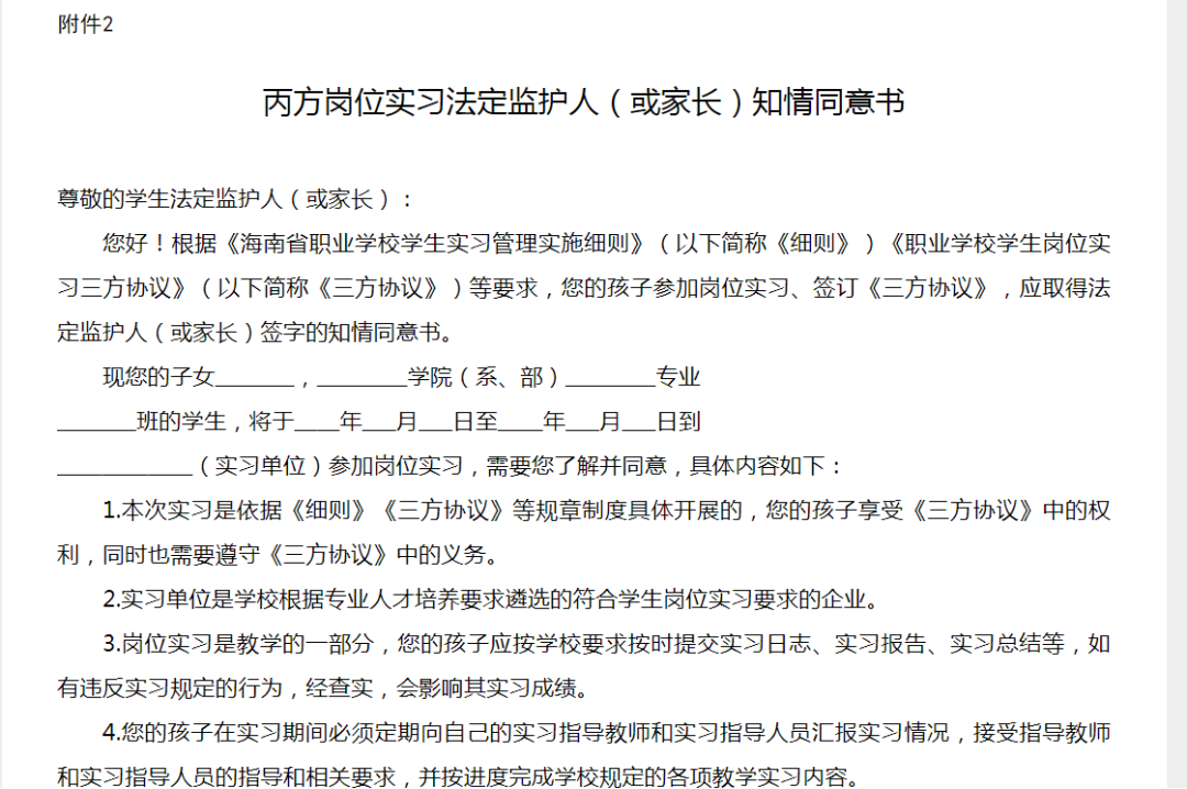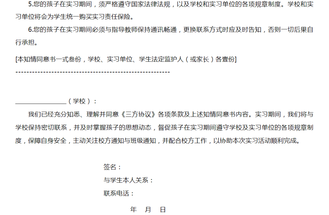 4.在簽訂本協議時,丙方應將實習情況告知法定監護人(或家長),并取得法定監護人(或家長)簽字的知情同意書作為本協議的附件。