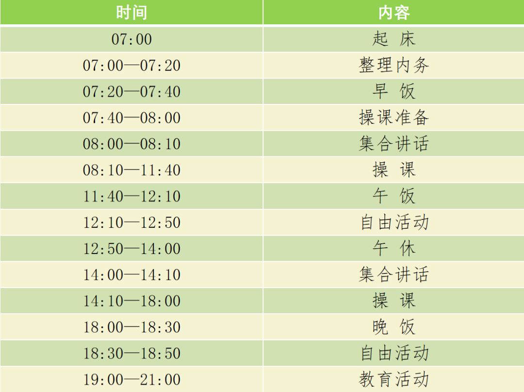 - Part 01 - 軍訓概況 基本情況 軍訓時間:2024年9月14日~9月27日 參訓人員:全體2024級本科生 訓練地點:北京林業大學校內 訓練內容 軍事技能訓練:軍姿、隊列、分列式、擒敵拳、匕首操、刺殺操、模擬打靶等 主題教育活動:各類國防教育活動、安全教育活動、心理健康教育活動等 雙爭活動:拔河比賽、拉歌合唱比賽、內務評比、長卷畫比賽等 作息時間 具體訓練時間會根據天氣情況酌情調整