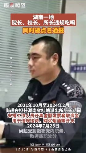 龍山縣桂塘派出所原所長尚超私設“小金庫”用于違規吃喝問題。2021年10月至2024年2月,尚超在擔任桂塘派出所所長期間,安排工作人員開具虛假發票套取資金,用于違規接待、購買煙酒等開支。尚超還存在其他違紀問題。2024年7月25日,尚超受到撤銷黨內職務、政務撤職處分。