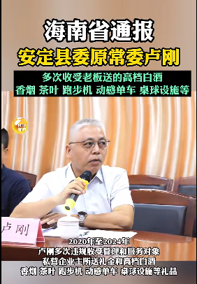 四、海南省教育廳職業教育與成人教育處原一級調研員、定安縣委原常委盧剛違規收受禮品禮金、違規接受宴請等問題。2020年至2024年,盧剛多次違規收受管理和服務對象、私營企業主所送禮金和高檔白酒、香煙、茶葉、跑步機、動感單車、桌球設施等禮品;多次接受管理和服務對象、私營企業主安排的宴請;將其本人在酒店的食宿費用交由工程個體承包商支付。盧剛還存在其他嚴重違紀違法問題。2025年4月,盧剛被開除黨籍、開除公職,涉嫌犯罪問題被移送檢察機關依法審查起訴。