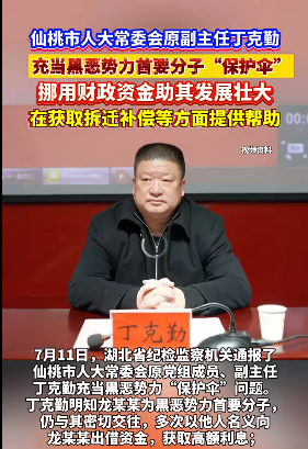 丁克勤明知龍某某為黑惡勢力首要分子,仍與其密切交往,多次以他人名義向龍某某出借資金,獲取高額利息;利用擔(dān)任仙桃市財政局局長等職務(wù)便利,挪用財政資金供龍某某實際控制的公司解決資金周轉(zhuǎn)困難,違規(guī)為該公司在返還土地出讓金、獲取拆遷補償?shù)确矫嫣峁椭L該團伙發(fā)展壯大。丁克勤還存在其他嚴(yán)重違紀(jì)違法問題,受到開除黨籍處分,按規(guī)定取消退休待遇,涉嫌犯罪問題被移送檢察機關(guān)依法審查起訴。
