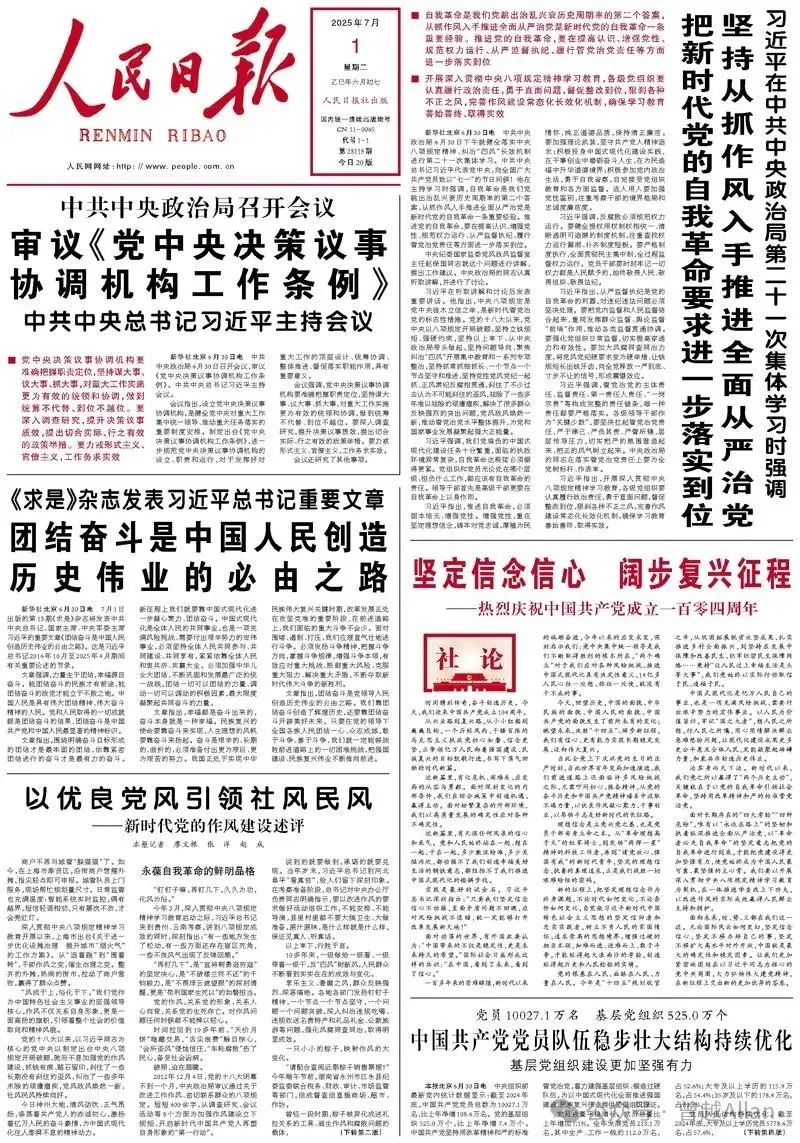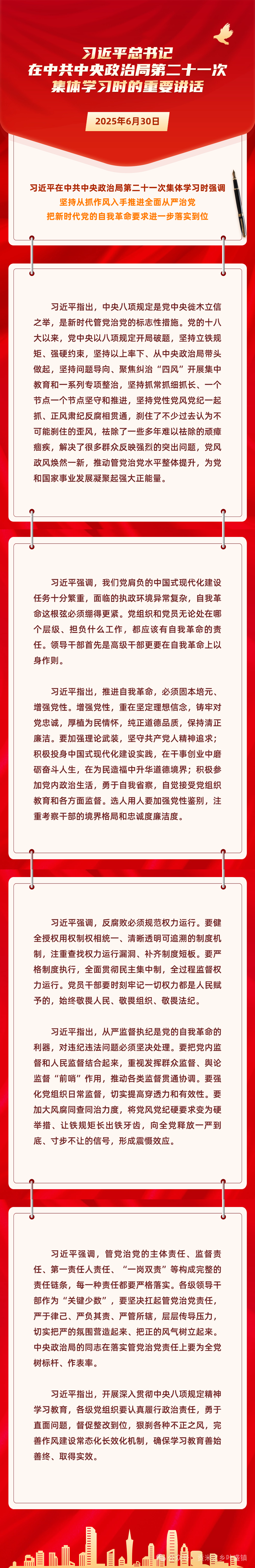 中共中央政治局6月30日下午就健全落實中央八項規定精神、糾治“四風”長效機制進行第二十一次集體學習。中共中央總書記習近平代表黨中央,向全國廣大共產黨員致以“七一”的節日問候!他在主持學習時強調,自我革命是我們黨跳出治亂興衰歷史周期率的第二個答案,從抓作風入手推進全面從嚴治黨是新時代黨的自我革命一條重要經驗。推進黨的自我革命,要在提高認識、增強黨性、規范權力運行、從嚴監督執紀、履行管黨治黨責任等方面進一步落實到位。