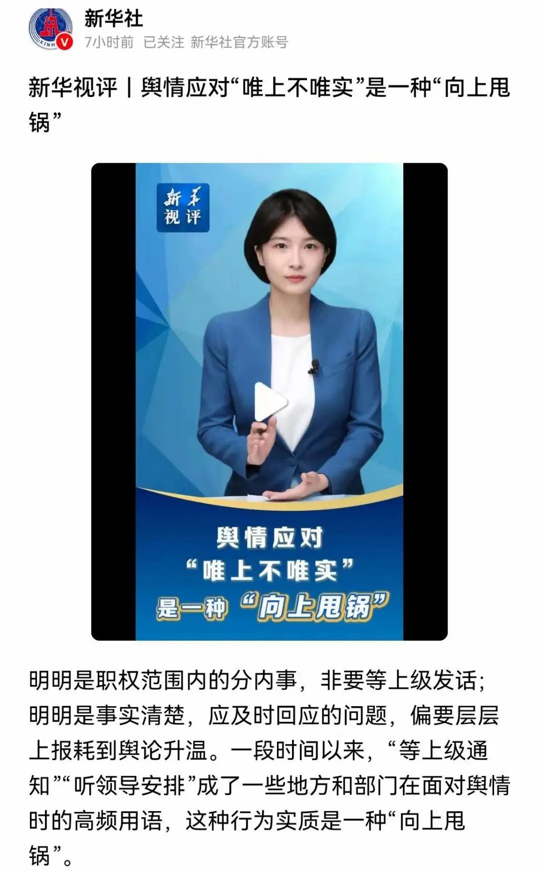 8月13日,新華社發表《新華視評丨輿情應對“唯上不唯實”是一種“向上甩鍋”》。