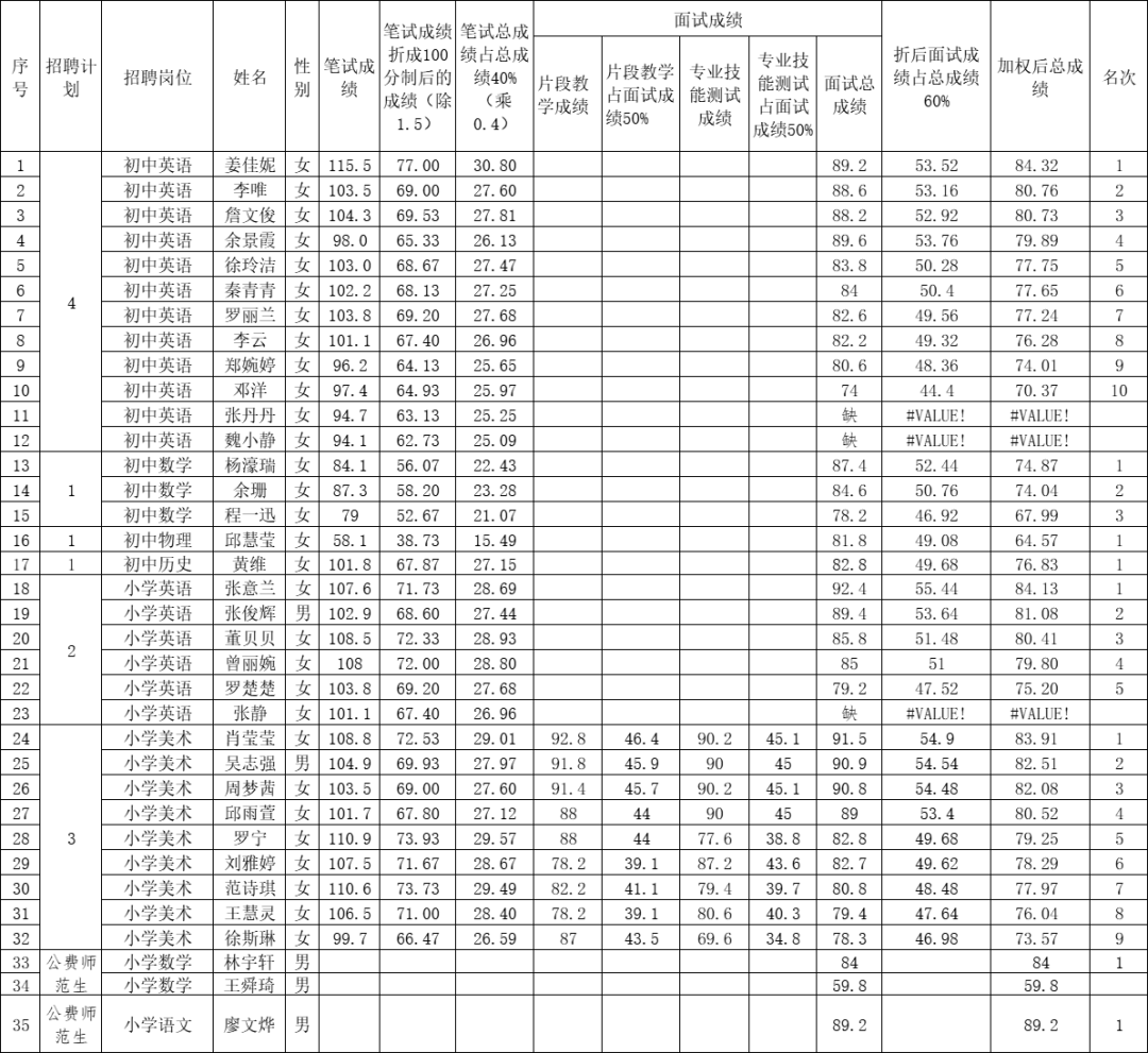 根據《三明市公務員局關于印發<三明市事業單位公開招聘工作人員暫行辦法>》(明人發〔2012〕33號)、《三明市人力資源和社會保障局〈關于核準三元區等縣(區)2024年中小學幼兒園新任教師公開招聘計劃〉的通知》(明人社〔2024〕26號)、中共三元區委組織部 三元區人力資源和社會保障局《關于確定<三元區2024年人才引進和招聘緊缺急需專業目錄>的通知》(元人社〔2023〕152號)、《三元區2024年中小學公開招聘新任教師通告》(元教人〔2024〕22號)、《三元區2024年中小學公開招聘新任教師入圍面試人員名單公示》(元教人〔2024〕84號)、《三元區2024年中小學公開招聘新任教師(公費師范生)面試公告》(元教人〔2024〕86號)和《關于三元區2024年中小學公開招聘新任教師小學美術崗位面試的公告》(元教人〔2024〕125號)等文件精神,現將三元區2024年中小學公開招聘新任教師小學美術總成績(名單附后)予以公告。