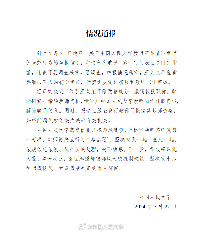中國人民大學關于教師王某某涉嫌師德失范舉報的情況通報