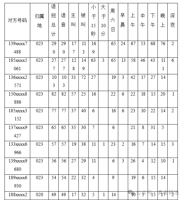 一般地,聯系最多的是其司機,而且與司機的通話時間一般都在 15 秒以內,因為其與司機通話主要是走與不走等三言兩語的話。上圖號碼一就是被調查對象司機的。其次聯系多的人一般是配偶或者家庭中的其他人員,時間可能多是晚上,通話時間偏長,上圖號碼二就是被調查對象妻子的。否則,是情人的可能性相當大。這一點也被實踐印證。當然,也有情人晚上基本上是不聯系的,還有的有多個情人,所以聯系人具體是什么身份,還要結合其他信息判定。