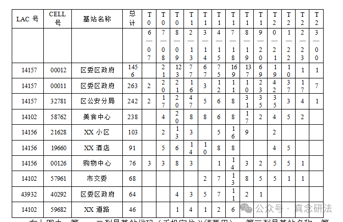 在上圖中,第一、二列是基站代碼(手機定位必須要用),第三列是基站名稱,第四列是通話時基站位置排序。后面幾列是時間段,如 6-7 點、7-8 點,下面幾行內的數 字是在某時間段內被查號碼通話的次數。假如上圖是該號碼在近6個月內的通話記錄分析結果,那么第二行第四列的 1456 就表明該號碼在近 3 個月內在某區委區政府基站位置通話1456次,其后的263也是在該基站位置。在區公安分局基站位置通話次數是242次。其在區委區政府基站位置通話次數遠遠大于在區公安分局等基站位置,這說明機主活動范圍就在區委區政府一帶。第二行第十四列的 19 數字就表明在該基站位置機主在20-21 點通話次數為 19 次。上圖表明在 22-24 點機主也主要在區委區政府基站位置,這說明機主住的地方也在區委區政府一帶。實際情況是機主是在區委區政府大樓上班,也居住在區委區政府附近的小區。第一個區委區政府基站位置表明他上班時主要在的地方,第二個區委區政府基站位置表明他晚上休息時所在的地方。我們還可以通過查找被調查對象周末、重大節假日(如春節)及其早上和夜晚手機通話基站位置確定其家人住址,這對家在外地的被調查對象更有針對性。同時,結合其家人手機通話情況確定家庭住地更準確。我們可以對比被調查對象與有關人員(如情人)的基站代碼(同網用戶直接比對,非同網的需要還原基站位置),以確定在一起的頻率與地點。還可以比對基站位置,確定被調查對象特定時間是否和誰在一塊,當然,需要他們那一時間點前后都要有通話記錄才行。通過上圖, 我們既可以分析出被調查對象的活動半徑、辦公住家地點,也可以結合相關人員的住家地點、辦公地點、電話號碼等情況進行排查關系人。