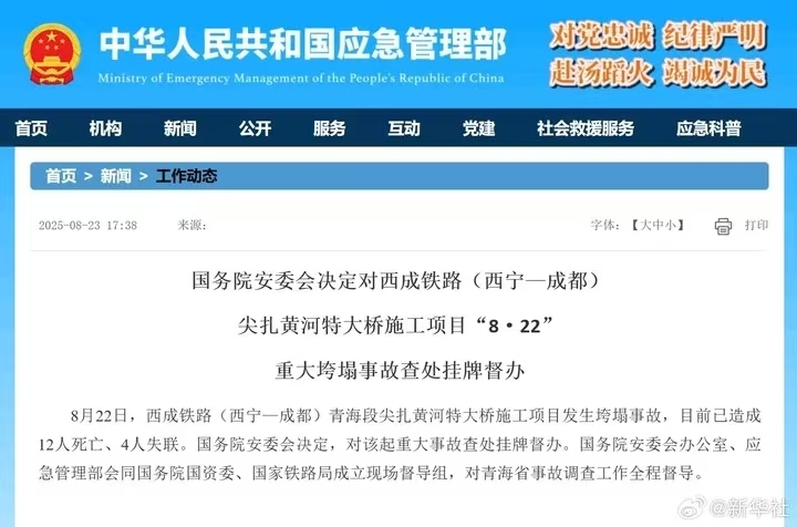 國務院安委會決定對西成鐵路(西寧—成都)尖扎黃河特大橋施工項目“8·22”重大垮塌事故查處掛牌督辦