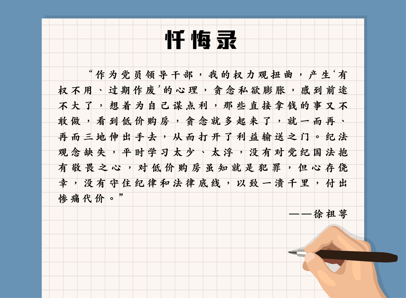 徐祖萼稱自己做夢也沒有想到,即將謝幕的政治生涯會因為低價購房而結束,賠上了自由的代價。這對他而言是一次慘痛的教訓,對其他人來說同樣是一次深刻的警醒:和徐祖萼一樣,很多干部倒下去都是因為違規房產交易引發的職務犯罪。