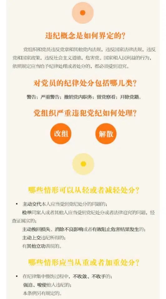 第一百二十八條 泄露、擴散或者打探、竊取黨組織關于干部選拔任用、紀律審查、巡視巡察等尚未公開事項或者其他應當保密的內容的,給予警告或者嚴重警告處分;情節較重的,給予撤銷黨內職務或者留黨察看處分;情節嚴重的,給予開除黨籍處分。