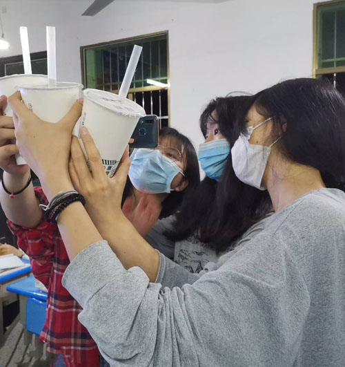 (圖為19電高二班同學(xué)們拿到班主任的奶茶慰問 高興的拍照)