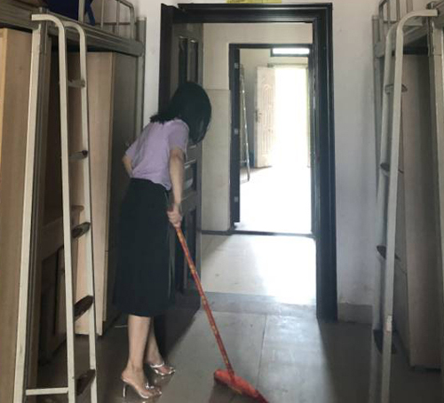 (開學(xué)前,班主任幫每個(gè)宿舍做好衛(wèi)生 圖為19美發(fā)三班王美老師在清理宿舍)