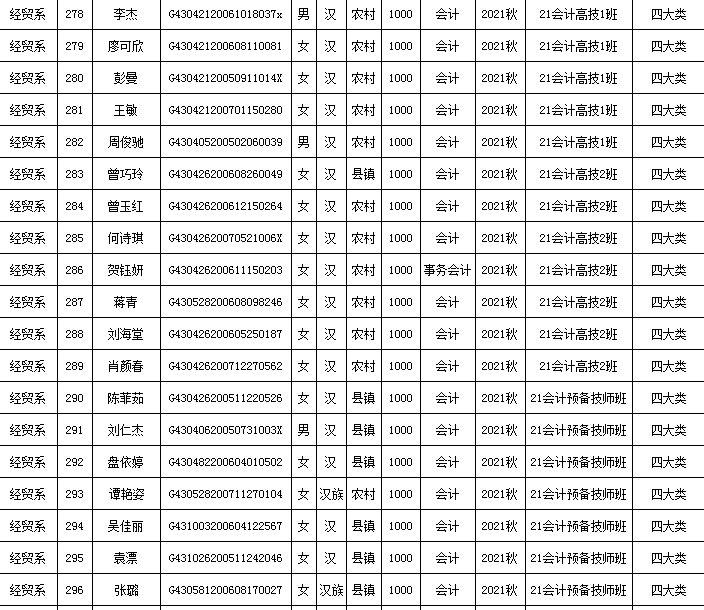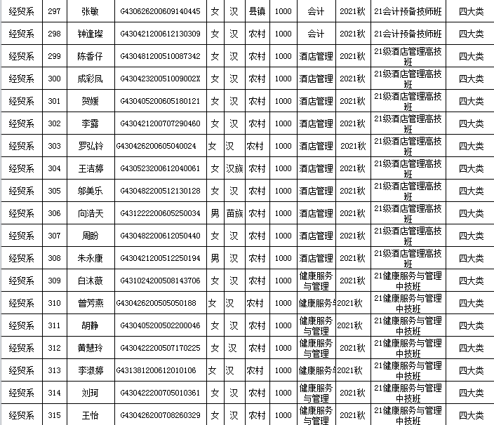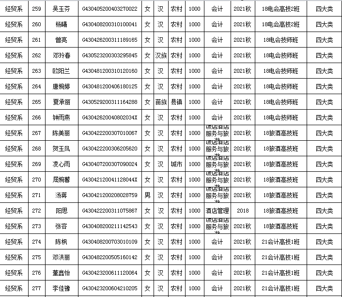 衡陽農工貿職業學校經貿系2021年度秋季助學金評定名單公示