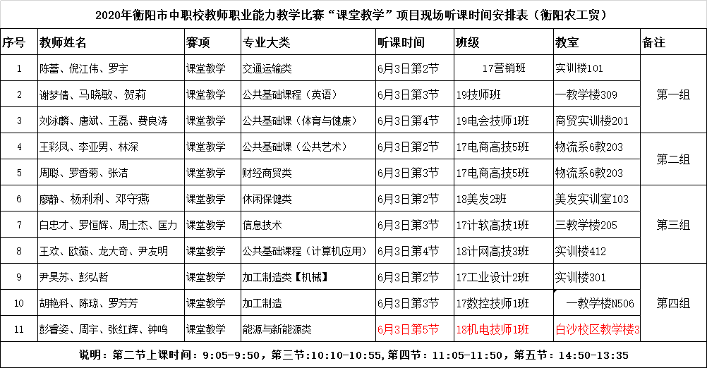 2020年衡陽市教師職業能力比賽-課堂教學比賽采用現場聽課方式,現定在6月3日到我校聽課,請各系(院)部通知下表中教師(組),做好參賽準備,按說明要求把聽課班級、教室地點等信息于5月30日報給教務處羅伏力。