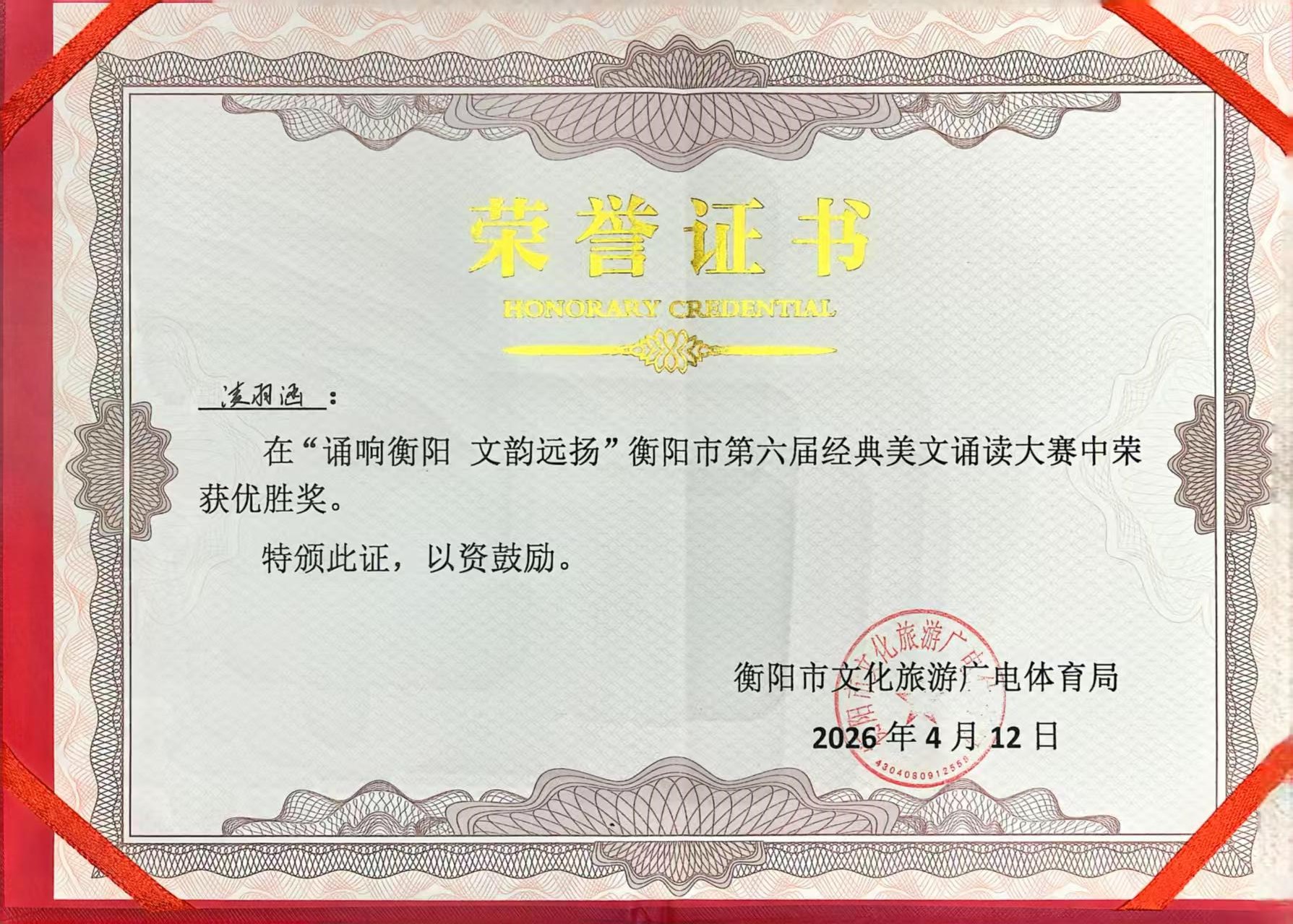 本次比賽由衡陽市文旅廣體局主辦,參賽選手以衡陽市各校教師、機(jī)關(guān)單位工作人員為主,整體水平高、競(jìng)爭(zhēng)激烈。面對(duì)實(shí)力強(qiáng)勁的對(duì)手,凌羽涵同學(xué)從容自信、聲情并茂,充分展現(xiàn)了扎實(shí)的語言功底與良好的精神風(fēng)貌。