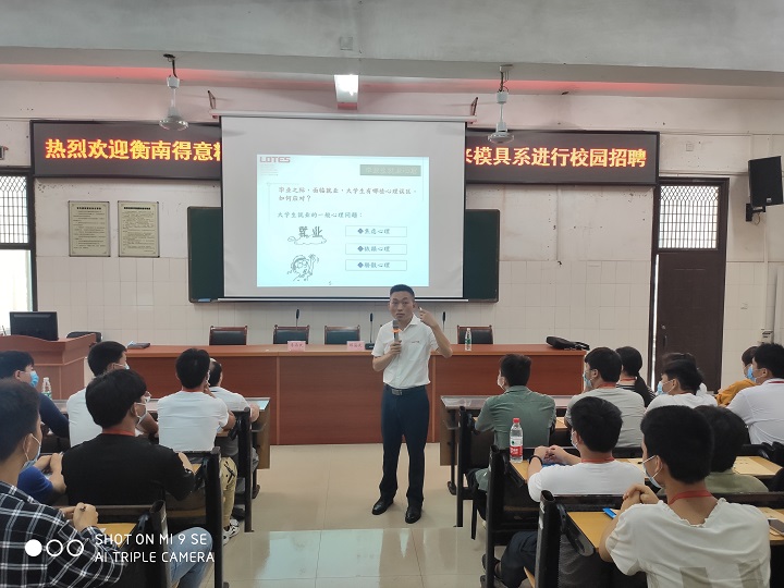緊接著,由衡南得意精密電子公司向華課長對本系部的廣大就業生進行一個就業專題講座,向華課長以三篇有趣的寓言故事開場,詼諧但又嚴謹的言語也讓全體就業生感到輕松的同時也發人深省,也為就業生指明了就業方向。