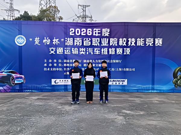 劉敏、易旗老師指導(dǎo)學(xué)生何佳霖、徐靈聰獲2026年度“楚怡杯”湖南省職業(yè)院校技能競(jìng)賽交通運(yùn)輸類汽車維修賽項(xiàng) 一等獎(jiǎng)