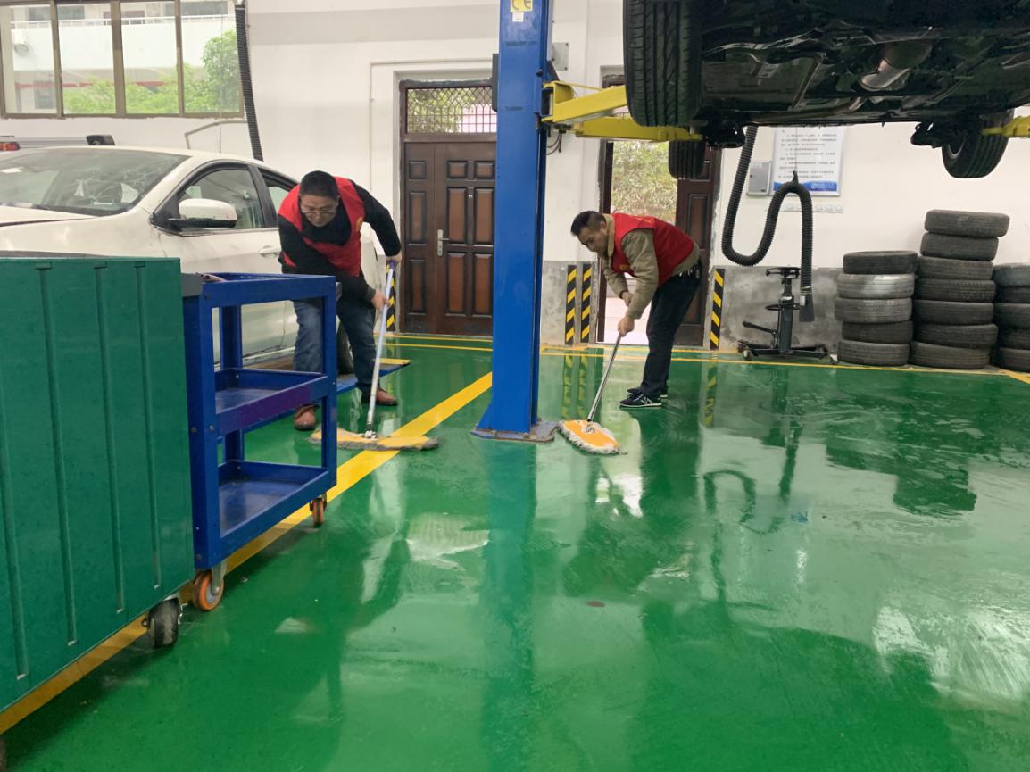 為讓同學(xué)們有一個(gè)干凈整潔的實(shí)訓(xùn)環(huán)境,教師們分別從實(shí)訓(xùn)中心處領(lǐng)取掃帚、拖把、抹布等清潔工具,分成四個(gè)小組在汽車(chē)實(shí)訓(xùn)場(chǎng)地打掃衛(wèi)生、擦拭車(chē)輛灰塵,規(guī)范工具擺放。