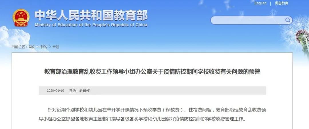 針對近期個別學校和幼兒園在未開學開課情況下預收學費(保教費)、住宿費問題,教育部治理教育亂收費工作領導小組辦公室提醒各地教育主管部門指導各級各類學校和幼兒園做好疫情防控期間的學校收費管理工作。