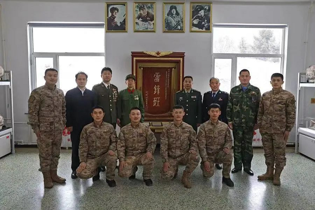 現(xiàn)任“雷鋒班”戰(zhàn)士(前排)和部分歷任“雷鋒班”班長(zhǎng)在營(yíng)房?jī)?nèi)合影。新華社記者 姚劍鋒 攝