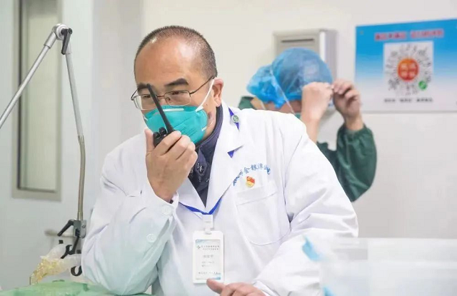 2020年1月27日,時(shí)任武漢金銀潭醫(yī)院院長(zhǎng)的張定宇在醫(yī)院綜合病區(qū)樓聯(lián)系、協(xié)調(diào)工作。新華社發(fā)(柯皓 攝)