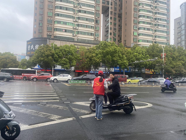 “叔叔,您好啊,非機動車不得隨意掉頭,逆行是非常危險的,還有請您帶好頭盔,安全第一。”活動中,學(xué)院志愿者正在對一位逆行的叔叔進行耐心勸導(dǎo)。