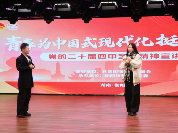 12月24日下午,“青春為中國(guó)式現(xiàn)代化挺膺擔(dān)當(dāng)——學(xué)習(xí)貫徹黨的二十屆四中全會(huì)精神主題宣講”在公共實(shí)訓(xùn)基地11樓多功能報(bào)告廳隆重舉行。衡陽市青年講師團(tuán)成員、中國(guó)共產(chǎn)黨衡陽歷史館講解員賀亦韜為在場(chǎng)師生帶來了一場(chǎng)別開生面的宣講,來自各二級(jí)學(xué)院青年團(tuán)員和教師代表共500余人參加。