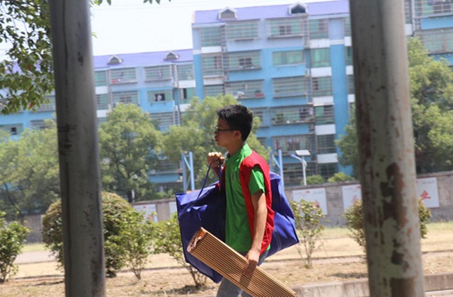 在38℃左右的高溫下,志愿者們一趟一趟地幫著新同學搬運行李到宿舍,汗珠打濕了雙眼和衣服,但他們的熱情絲毫沒有減少。有的志愿者衣服褲子都濕透了,明明宿舍就在眼前,他們卻把褲腿一扎,說道:“沒事,等結束了再去換衣服!”
