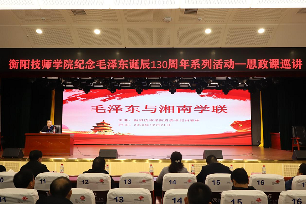 12月21日下午,衡陽(yáng)技師學(xué)院紀(jì)念毛澤東誕辰130周年系列活動(dòng)——思政課巡講,在公共實(shí)訓(xùn)基地11樓學(xué)術(shù)報(bào)告廳舉行。學(xué)院黨委書記肖春林以《毛澤東與湘南學(xué)聯(lián)》為主題進(jìn)行授課。學(xué)院黨委班子成員、師生代表共500余人參加。